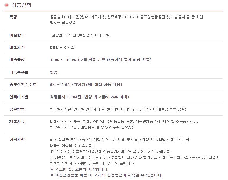 요즘 전세자금대출이 어렵다고 하는데 롯데캐피탈에서도 가능합니다. 공공임대아파트 전월세 입주자 및 입주예정자(SH, LH,지방공사 및 공무원연금공단에 해당되는 분들을 위한 상품입니다. 대출한다고 1천만원~5억원까지 보증금 최대 80%까지 가능합니다. 대출 금리는 저렴한 3%~10%까지 이며 중도 상환수수료와 연체이자율은 동일 합니다. 상환방법은 만기일시상환이며 제출서류는 대출신청서, 신분증, 전입세대열람원, 배우자신분증, 인감증명서, 소득증빙서류, 가족관계증명서, 주민등록등본/초본, 임대차계약서 입니다. 서류가 조금 많긴 하지만 대출이 까다로워진 현재 대출금리가 저렴하게 나온다면 괜찮은 상품인것 같습니다. 이 외에도 롯데캐피탈의 상품을 확인하여 문의하신 후 좋은 결과 있길 바라겠습니다.