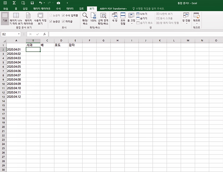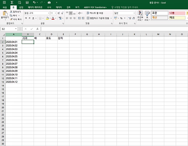 날짜를 아래에 기입하고 위에는 품목을 적어놓은 상황입니다. 그리고 갯수를 중앙에 적어야 할때를 예를 들어보겠습니다. 이런 경우 품목이 사과와 배 포도 감자 이외에도 무수히 많은 품목이 있을 수도 있고 4월1일부터 시작해서 12월까지 가는 경우도 있을 수가 있습니다. 그럴 때 과도한 수정이 필요할때 일일이 내려가며 돌려가며 하기가 불편할텐데요