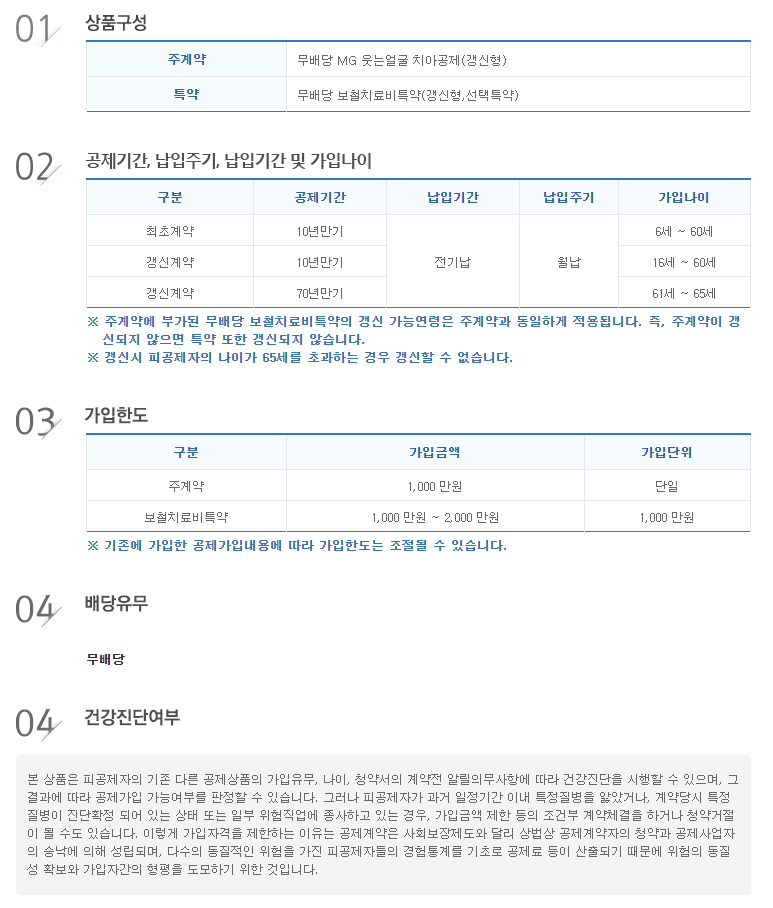 공제기간과 납입주기 그리고 가입나이 까지 자세히 나와있습니다. 특히나 새마을금고 치아보험의 가장 큰 장점은 저렴하다는 점에 있습니다. 나이에 따라 금액이 달라지겠지만 타 보험사에 비해 가격은 저렴하고 보장은 비슷한 수준이니 한번 알아보시는걸 권장드리겠습니다. 참고로 배당뮤누는 무배당입니다.